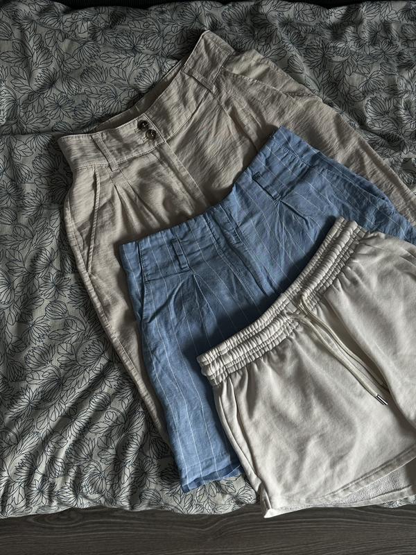 Голубые шортики с льном в составе,стан 3/5,на размер С,цена-199 Бежевые спортивные шортики,стан идеальный,размер С-М,цена-319 Бежевые бермуды с льном в составе,стан отличный,легкие и удобные, размер С,цена-409