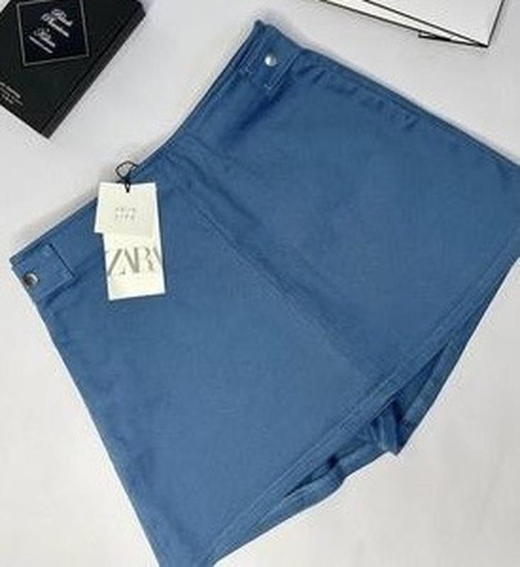 Сине голубые шорты, с переда юбка, из плотной очень качественной ткани, которая красиво держит форму вещи. Талия высокая, со стороны есть скрытая молния, фурнитура кнопки, замеры на фото