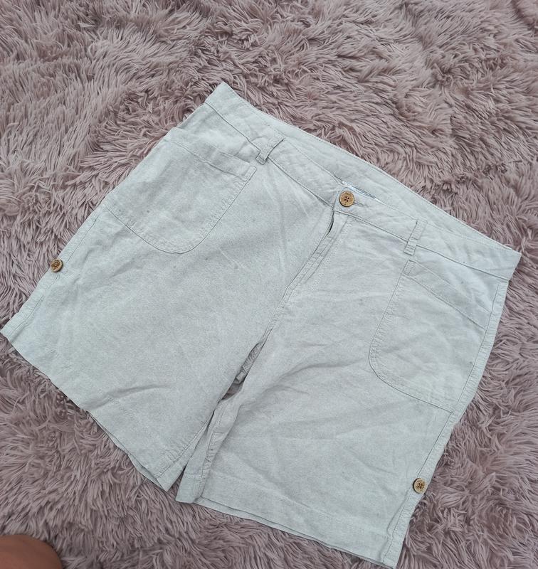 Льняные шортики, размер 16uk, замеры: длина 44, ПОТ 50, ПОБ 61, посадка 29/42. 55% льон, 45% котон.