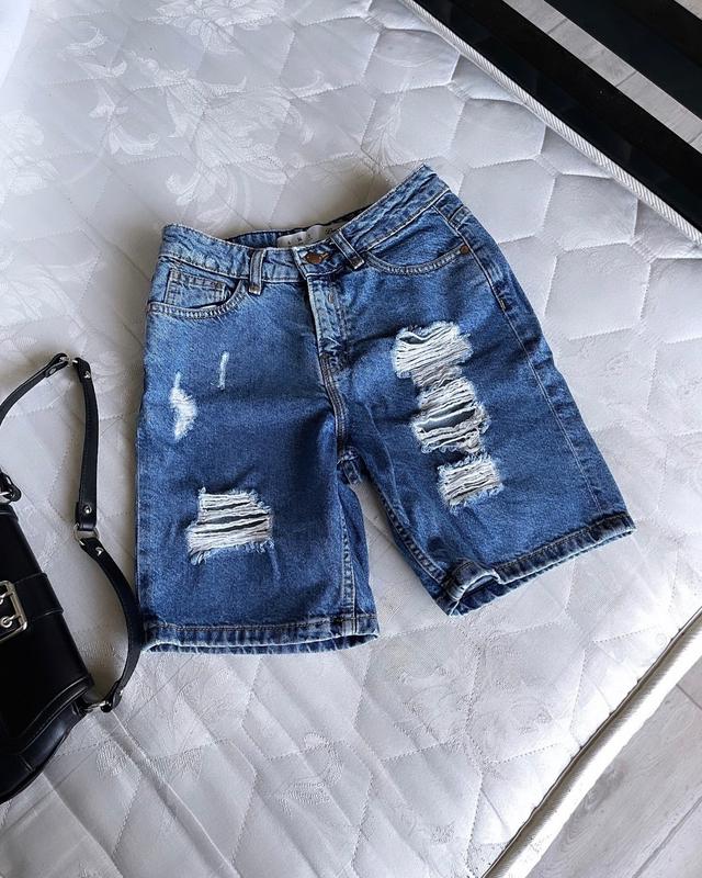 Джинсовые шорты 😍 Котон 100%, не тянется Размер: С смотрите замеры Замеры изделия: Пояс 34 см Посадка 26/30 см Бедра 50 см Длина сбоку 43 см пошаговый 19 см Стан: новий ❤️