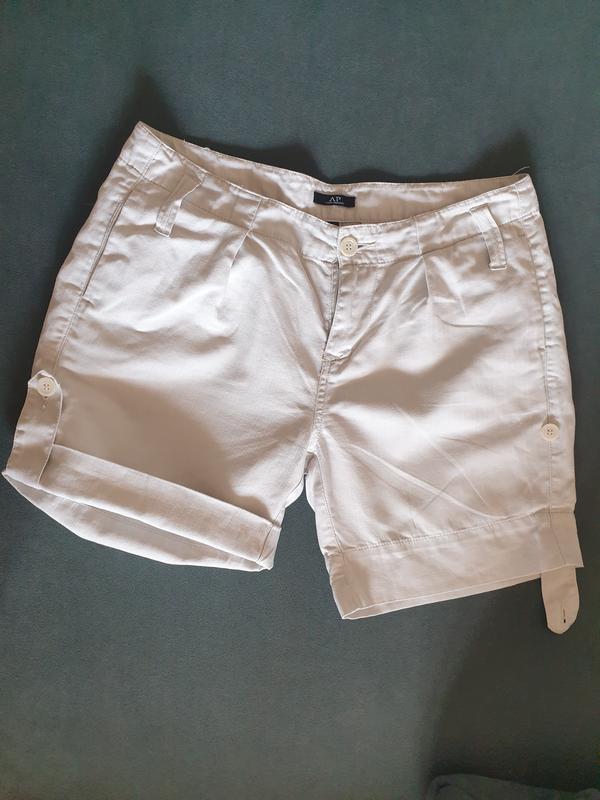 Белые шорты Avant Premier 68% котон 32% льон Подкатываются и застегиваются по бокам на пуговицы. Низкая талия Снаружи в очень хорошем состоянии, внутрение карманы немного покашлатани (фото добавила), поэтому цена символична Длина 39см Высота матни 23.5см Талия пол 43см Бедра пол.54-55