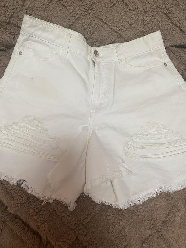 Продам белые шорты с высокой посадкой ,за счет спереди рваной части ,смотрятся очень красиво ! Спереди ножка видна ,а сзади закрыта