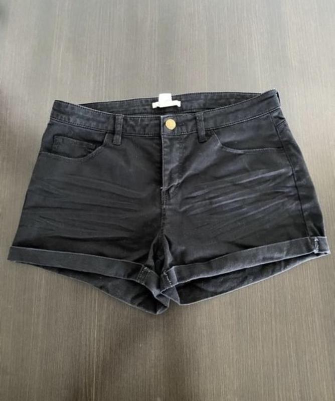 Шорты черного цвета со стрейчем. Длина по боковому шву 27 см. По поясу 36 см, тянется до 40 см. По всей длине тянутся на 5-6 см. Посадка впереди 27, сзади 20 см. Ширина штанины вверху 28, По бедрам 43 в области замка, 50 в области пахового шва. Состояние новой вещи, джинс летний
