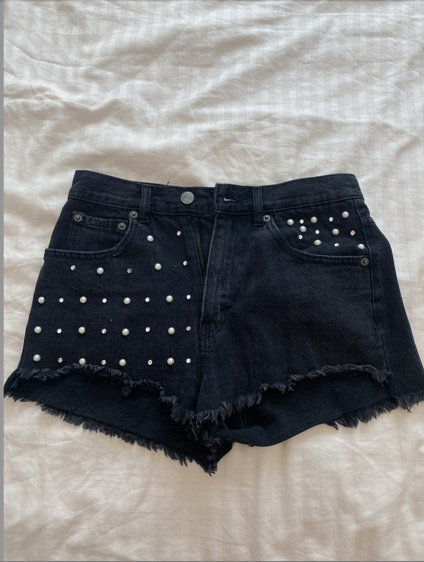 Черные джинсовые Шорты Pull & Bear. Почти новые, купленные в ТЦ. Декорированы камушками. Размер 36 (26). Но 26 - это XS. Средняя посадка. Ширина талии спереди - 34 см. Длина по центу - 28 см Довжина сбоку спереду - 25 см, сзаду - 28 см.