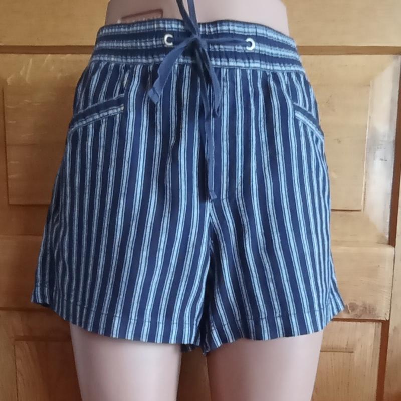Фирменные льняные шорты с карманами, в полоску, ПИТ 37-40, ПИБ 55-57, длина изделия 32, ширина штанины снизу 32.