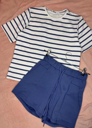 Футболка в полоску одета 2 раза Шорты новые Костюм в размере s Пояс на резинке ( хорошо тянется) Функционирующие карманы. Ткань качественная 2х нить( хорошо видна на 3 фото) приятные на ощупь