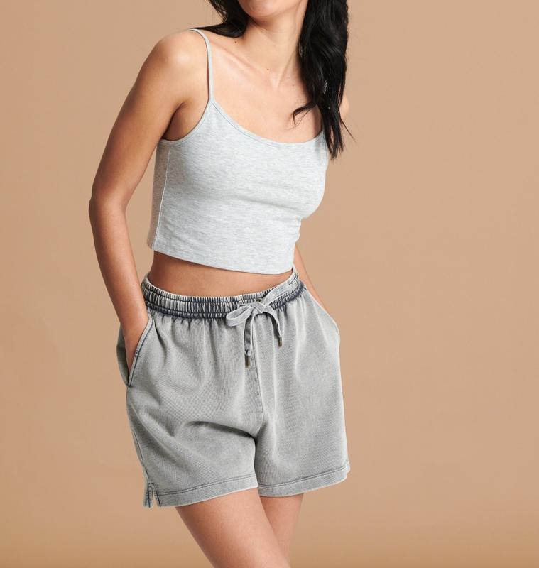 Шорты свободного кроя темно-серого цвета. Два кармана, вареный эффект, пояс на завязках. Материал: 100% хлопок. Размеры: ХХС-ХЛ