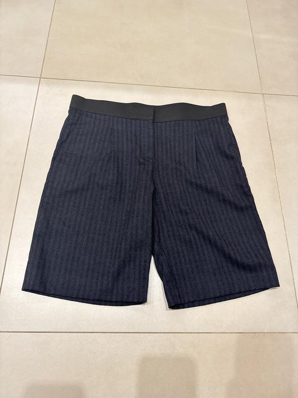 Шерстяные темно-синие в сероватую полоску шорты от Jil Sander. Размер 34. На 27-28. Крой чуть выше колена, имеет два кармана по бокам и одну скрытую сзади. Состояние новых.