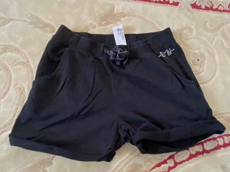 Черные трикотажные шорты ХС размера, пару раз починились. Пояс - 35см, поб- 50см, длина - 33см, передняя посадка - 26см, задняя - 37см, штанка на выходе - 28см в полуобъеме.