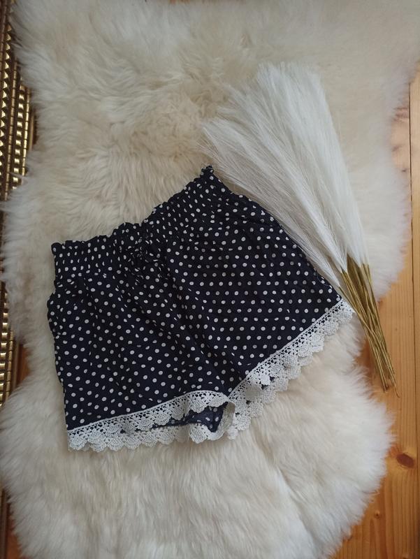 интересные шорты высокой посадки темно-синие в горошек с белым кружевом