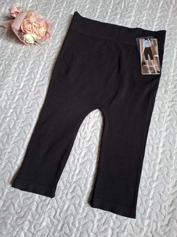 Велосипедки женские в рубчик черного цвета. На бирке указан размер 48-54, но они маломерят. Отлично подойдут на размер 42-46 Замеры: длина - 54 см ПОТ - 31 см ПОБ - 32 см. Хорошо тянутся. Бесшовные. Склад : 60% котон, 30% поліестер, 10% спандекс
