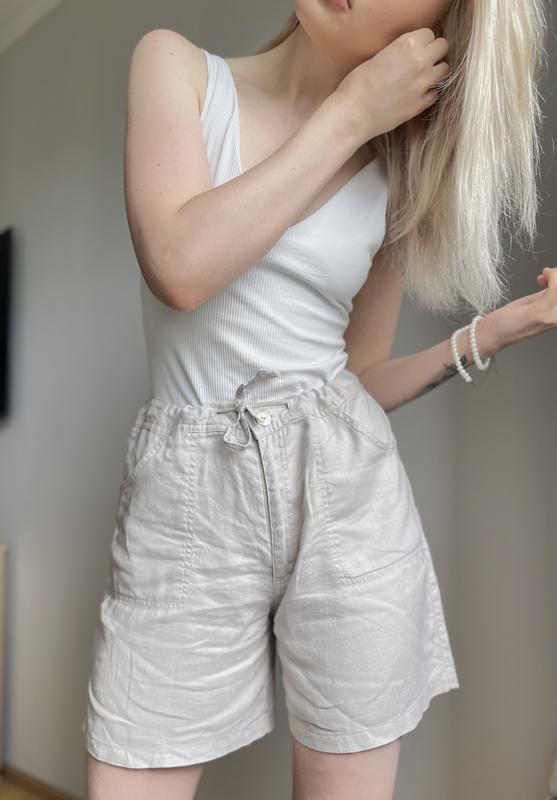 Шорти з льону від бренду Casual Ідеальна довжина, легка текстура та той самий натуральний відтінок, який пасує до всього. Мають кишені й ґудзик ніби з мушлі Розмір 38 (М) напівобхват талії 40 см, регулюється шнурівкою. Мають кишені й ґудзик ніби з мушлі 100% льон Стан ідеальний,єдиний нюанс - трішки вилізла нитка,на тілі взагалі не помітно (фото в каруселі)