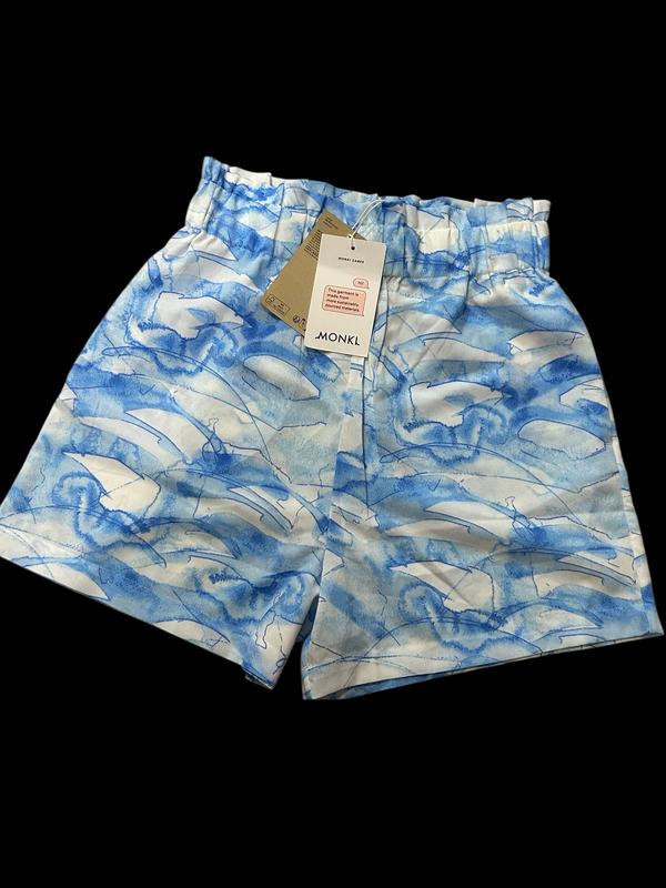 Легкі літні шорти з високою талією та еластичним поясом. Виконані з приємної на дотик тканини з абстрактним принтом у біло-блакитних відтінках. Вільний крій забезпечує комфорт і стильний вигляд у спекотні дні. Ідеально поєднуються з однотонними топами та футболками.