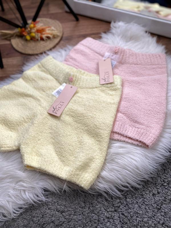 Прохання через кнопку КУПИТИ замовлення НЕ ОФОРМЛЮВАТИ🪐 Відправка новою поштою💌 Шортики з цікавої тканини, типу махрові) Дуже мʼякі🤍 Розмір М Залишились жовті Довжина спереду 36, ззаду 38 Пот 36 Поб 45 Дуже добре тягнуться 👌🏻