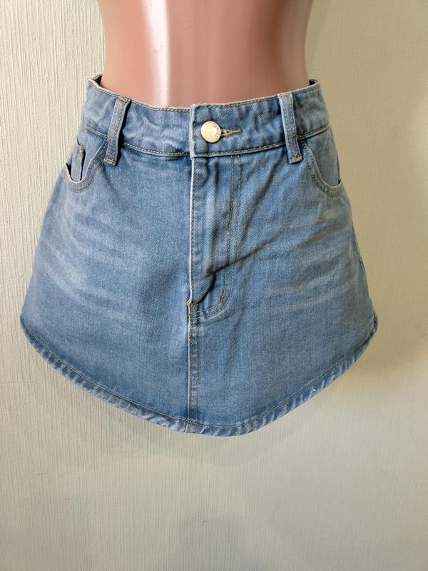 В идеальном состоянии джинсовые шорты юбка на девушку 48-50р. Длина по боковому шву с поясом 29см, длина с поясом до памперса 40см, талия 40см, бедра 54см.