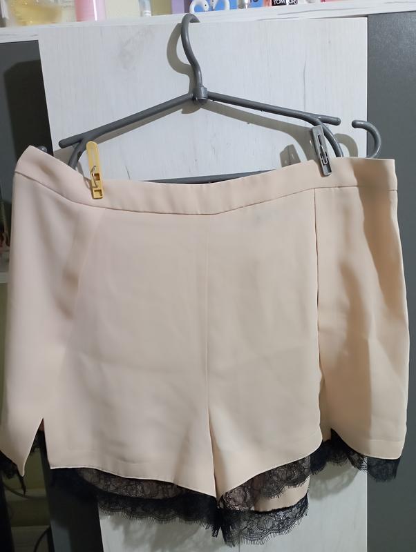 вещь нового состояния, за исключением зачеркнутой этикетки. шорты отделаны красивым кружевом, пошива очень качественное.спереди имеют разрезы. талия -44.стегна -56 длина вместе с поясом -37
