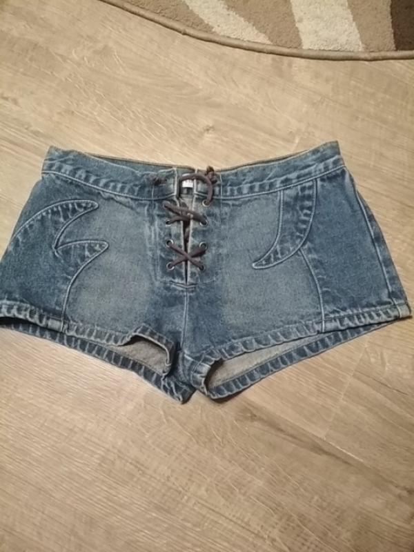короткі джинсові шорти на зав'язках: довжина - 23 см, висота посадки -21/32, ширина в поясі - 36 см