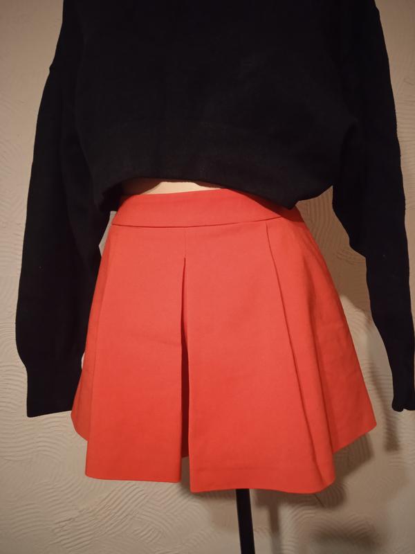Шорты юбка красного цвета, сбоку на молнии. Длина 32 см в поясе 36 см полуобхват, высота посадки 29 см.