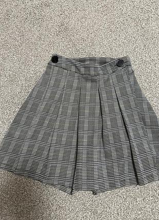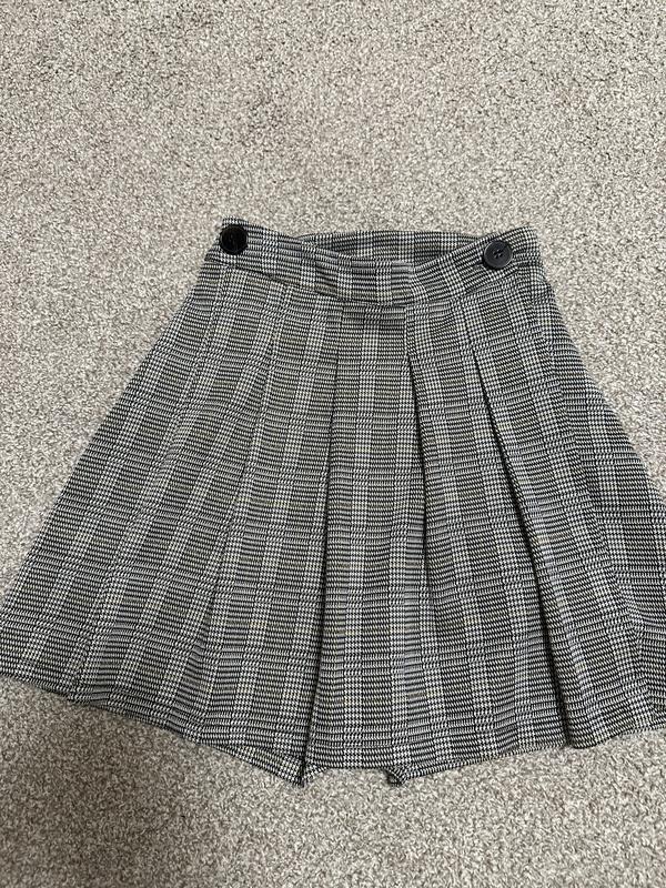 плісирована міні-спідниця-шорти із візерунком «гусяча лапка» чорно-білого кольору. Вона має високу посадку, плісировану передню частину, дві декоративні ґудзики на поясі та приховану