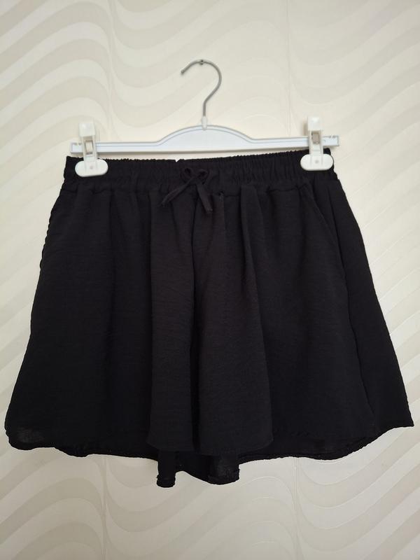 черные шорты- юбка с карманами на хорошо тянущейся резинке длина изделия 38см полу охват от 34см, тянется до 48см. ткань вискоза, красиво садятся по фигуре. ткань легкая и не мнется. подойдет для девушек и женщин со стройной фигурой.