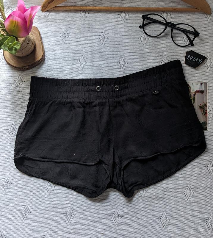 Шорты Онинал размер маленький шорты для отдыха, пот в состоянии покоя 37 тягную до 46 будет на размер S 36 поб покоя 47 если расправить полностью потянуть то будет 51 сбоку до разрезе где-то 23, на ощупь вискоза принт черный на черный его не очень сильно заметно но он есть и хорошенький.