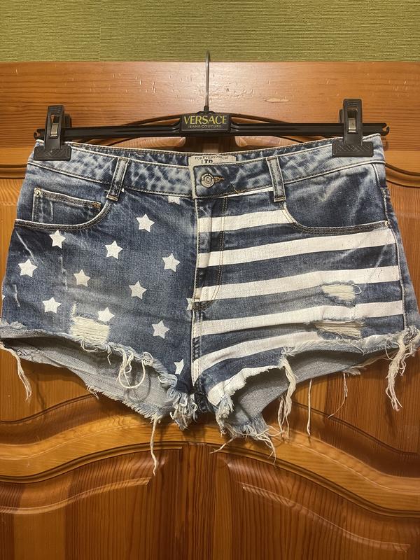 Шорты джинсовые рваные по краям с бахромой, со звездно- полосатым принтом. Шорты короткие, размер М(44-46). Длина шорт 25 см, ширина в бедрах 52 см, в поясе 42 см, высота сзади по шву 39 см.