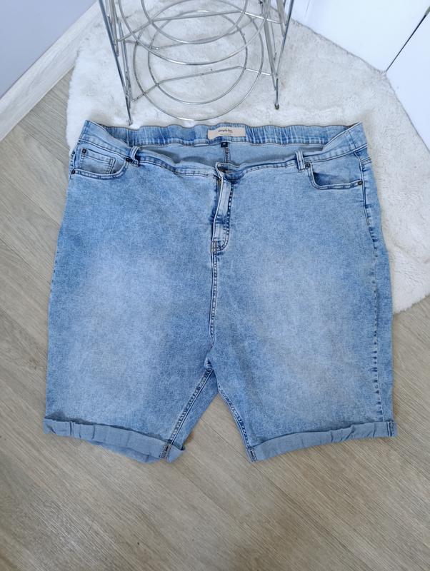 женские джинсовые шорты светло-синего цвета с высокой посадкой. Изделие имеет подвернутые края штанин и пояс на резинке, что характерно для моделей больших размеров (plus-size), обеспечивающих комфортную посадку по фигуре. Rozetka Rozetka +1 Основные характеристики Тип изделия: Удлиненные джинсовые шорты или бермуды. Материал: Деним, часто с добавлением стрейча для лучшей растяжимости. Особенности дизайна: Пять классических карманов, застежка на пуговицу и молнию, пояс с эластичной вставкой (резинкой) сзади или по всему кругу для удобства. Стиль: Повседневный (casual), модель с эффектом потертости (stone washed). пояс 140-150 бедра в спокойном состоянии 140 в меру натянутом 150 максимально 160 длина 57 посадка 42 сзади 47