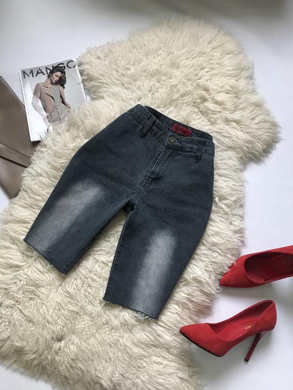 Шорты велосипедки джинсовые серые, высокая талия, стройнят, очень классные, тянутся, размер 25 С Хс Длина 47, пояс 33 тянется до 35, бедра 42 тянется до 48, шаг 24,5, посадка 24