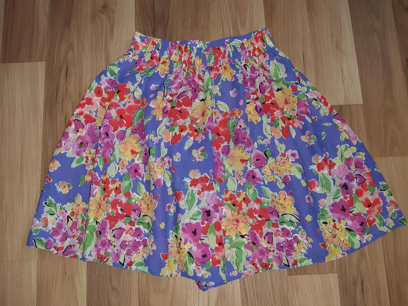Красивые яркие шорты-юбка в цветочный принт, размер 12,сзади на резинке,100%полиестр. Пот 40-45,поб до 55,посадка 36/33,шир штанини внизу 35-36,довж 38-39.