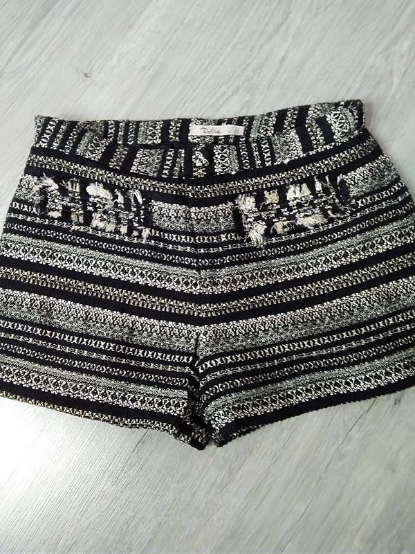 длина 31 см п.талия 40 см п. бедра шорты средней посадки,длина до проймы 28 см. черные с золотистым люрисковим узором.