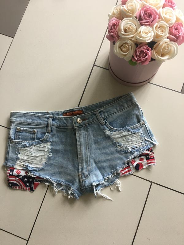 Красивые джинсовые шорты. Купила заграницей, поправилась, влезть не могу. Бирки сняла, ни разу не надела. Пояс не на талии, ниже. На бедра максимум 97, можно меньше. Замеры на фото. Оплата на карту Приватбанка, возврата нет Смотрите мои объявления, хорошего дня}