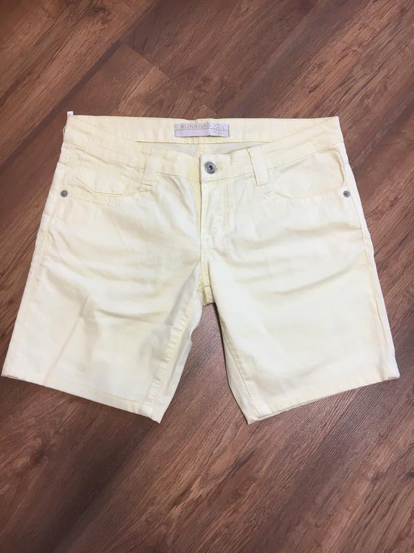 Нові шорти, 29 розмір Колір жовтий, ніжний, приємний для очей Склад: 98% бавовна, 2% еластан Тягнуться трошки Заміри: довжина 38 см., шаговий шов - 20 см., посадка спереду - 19 см., ззаду - 26 см., Півобхват в поясі 38 см., бедер -45 см