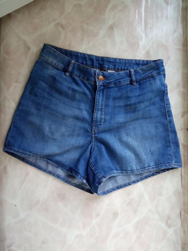 Короткие джинсовые шорты с высокой посадкой выполнены из не плотного денима с эластаном. Размер указан 12. Замеры: ПОТ-41 ПОБ-55 Длина-35 Длина по внутреннему шву-10 Ш низу-34 см. Состояние очень хорошее.