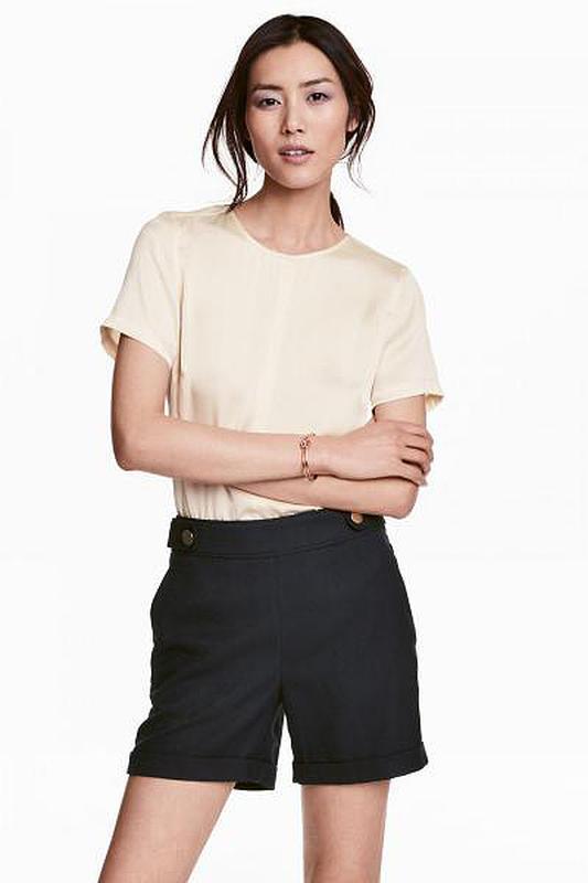 нарядные шорты от бренда H&M разм. 44 № 0477122001 Мерки: пояс 43см, поб 57см, длина 42см Шорты из эластичной такни. На шортах высокая талия и хлястики на пуговицах по бокам. Боковые карманы и потайная молния с одной стороны. Пристроченные отвороты внизу брючин.