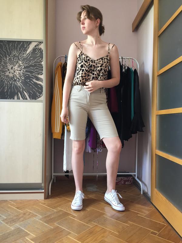 Трендовые шорты бермуды бежевого цвета. Есть такие же в фиолетово-синем цвете. В продаже также майка. Новые с бирками