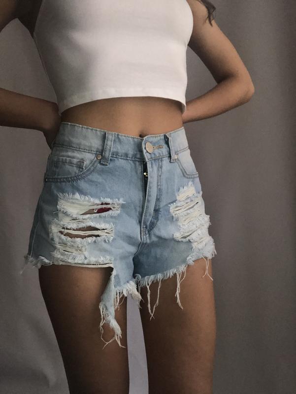 Крутезні джинсові шорти, як нові, з трендовими рваностями, є кишені, висока посадка, з необробленим низом, 100% бавовна, якість-чудова ! Розмір: S/M