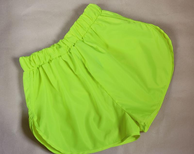 Шорти в кислотному кольорі. З боків є невеличкі розрізи. Матеріал легкий, типу плащової тканини, не тягнеться. Напівобхват талії - 34 см., коли резинка не в розтягнутому стані, напівобхват стегон - 59 см., довжина - 38 см.