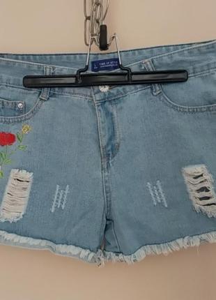 Джинсовые шорты с вышивкой и рваными вставками. ПОТ 40 см. ПОБ 51см. Посадка 24/29