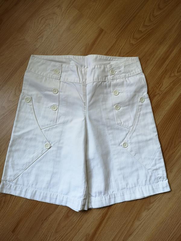 Очень классные котоновые шорты на высокой посадке, длина по боковому шву 45 см, шаг 24 см, пояс 5 см, талия верх пояса 37, низ пояса 40 см, можно отрегулировать перешив пуговицы, бедра 50 см, низ штанины 29 см. Посадка спереди 22 см, сзади 35 см , большие боковые карманы. Шикарно смотрятся с двумя соседними футболками.