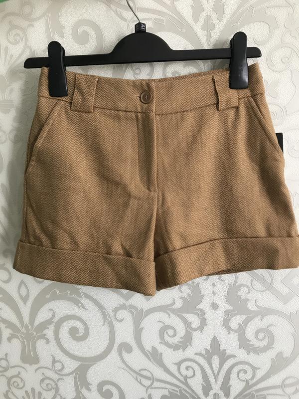 Шорты Mango. Новые, с биркой. 57% полизстер, 27% шерсть, 14% вискоза, 2% зластан. Замер: Пот-34 тянется до 36 см Поб-47 Длина-32 см