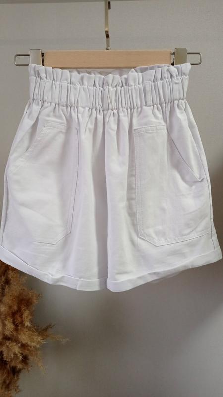 Белые шорты с высокой посадкой. К шортам идет коричневый пояс. Полуобхват талии 27 см. Резинка очень хорошо тянется. Обхват бёдер 52 см Длина 37 см Цена 270 грн