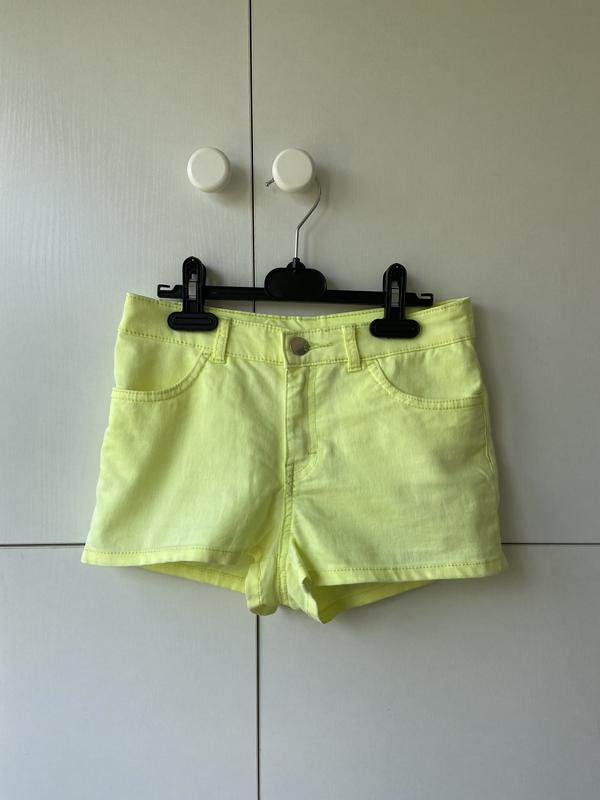 Шорты, лимонного цвета, параметры: талия - 62 см, бедра - 88-90, длина от пуговицы до внутреннего шва - 21 см.