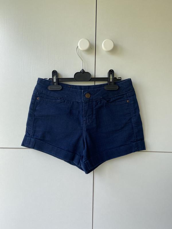 Шорты, темно-синего цвета, х/б, параметры: талия - 62 см, бедра - 88, длина от середины пояса до внутреннего шва - 21 см.