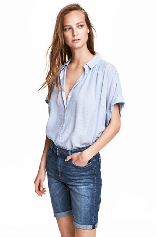 джинсовые шорты от бренда H&M разм. 40 № 0512508001 Мерки: пояс 37см, поб 42см, длина 43см, шшс 20см, шшв 23см Шорты с пятью карманами из эластичного стираного денима. Талия стандартной высоты и узкие брючины с пристроченными отворотами снизу. Застежка на молнию. Цвет: голубой деним Состав: 99% хлопок, 1% эластан