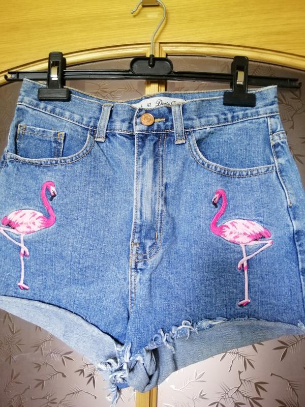 Джинсовые шорты в идеальном состоянии от Primark, с шикарными вышитыми фламинго спереди. Состояние идеальное, одевали пару раз. Посадка высокая. Замеры: пот ~36 см, поб 47 см, длина по боковому шву 28 см.