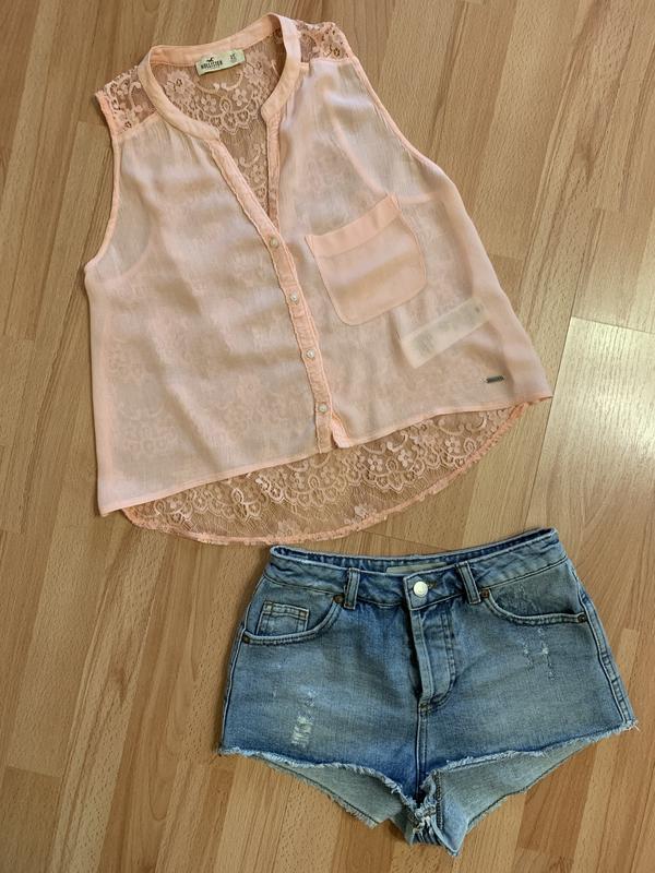 Комплект XS-S. Будет так же и на подростка Блузочка HOLLISTER, размер XS, длина 47-56 см, пог 44,5 см. Есть нюанс, затяжечки (см послелние доп фото). Спинка вся ажурная. Шортики TOPSHOP, размер 26, длина спереди 22-23 см, сзади 23-29 см, пот 33 см, утяжки нет. Цвет в реале светлее, голубой. Сост отл. Комплект 150 грн