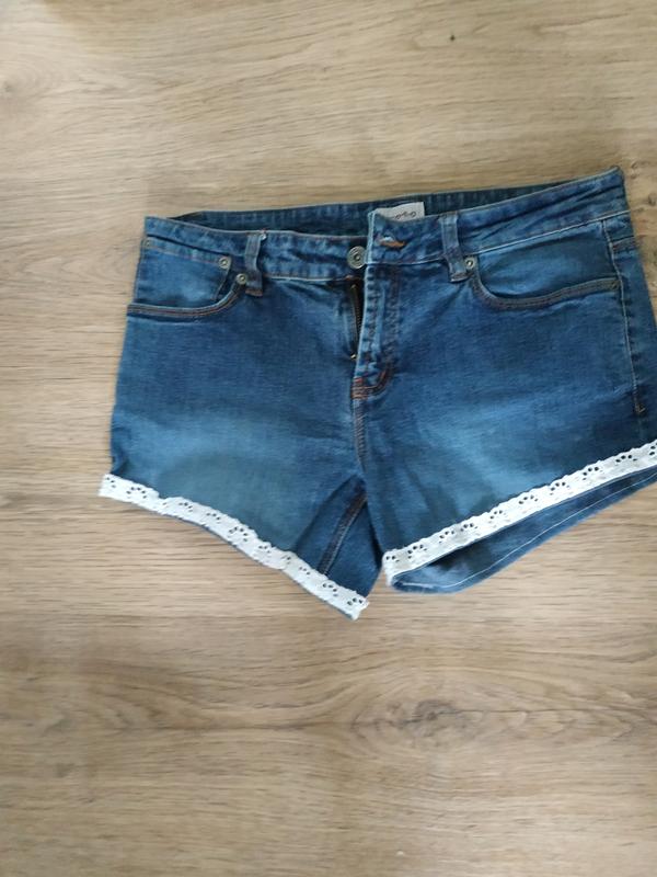 Джинсові шорти з кружевом в ідеальному стані фірми m-o-t-o талія занижена ПОТ - 39 см ПОБ - 41 см довжина по боковому шву - 23 см посадка - 22 см