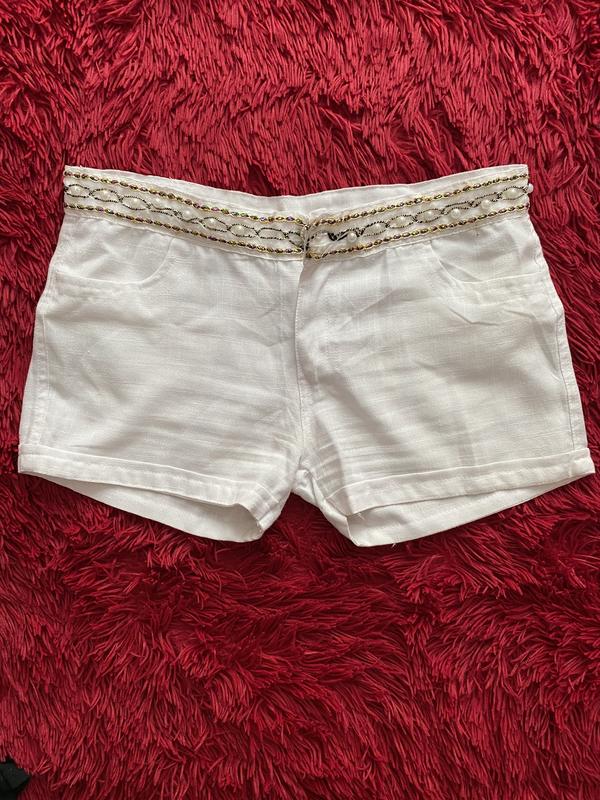 Білі коротенькі шорти з гарно обробленим поясом та гудзиком.