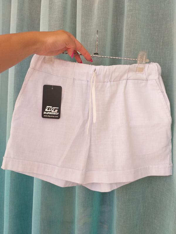 -білі шорти -тканина льон -з кишенями -легкі,зверху йде гумка,шнурок затягується -розмір Л, 48