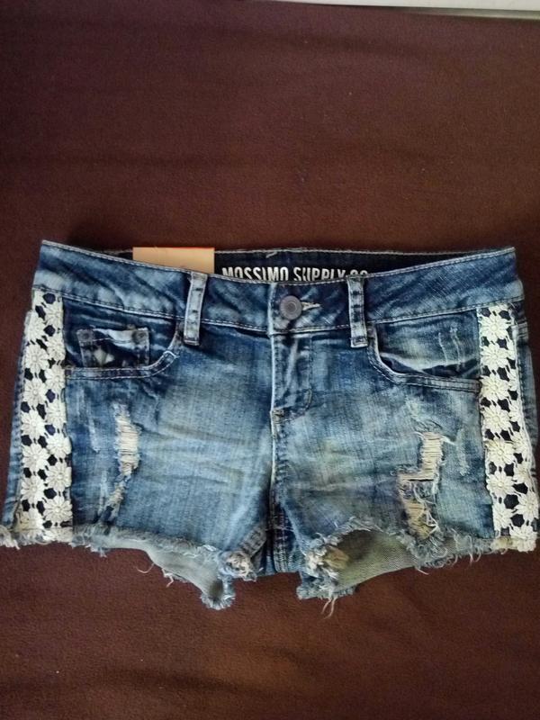 Шортики джинсовые от MOSSIMO SUPPLY CO. Новые Размер 5. В поясе 78 см. В бедрах 90 см. По бокам вставки из кружева. 99% cotton. Новые, с бумажной этикеткой. Есть много других интересных вещей